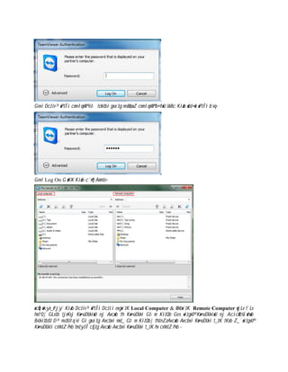 Team Viewer is a software that allows sharing screens and transferring files between computers remotely. To use Team Viewer, both computers must have the software installed. An internet connection is required, as remote control will not work without it. The document provides step-by-step instructions on how to use Team Viewer to remotely access and transfer files between computers. It explains how to start a remote session by entering your ID and password, access the other computer's desktop, and transfer files between the two systems.