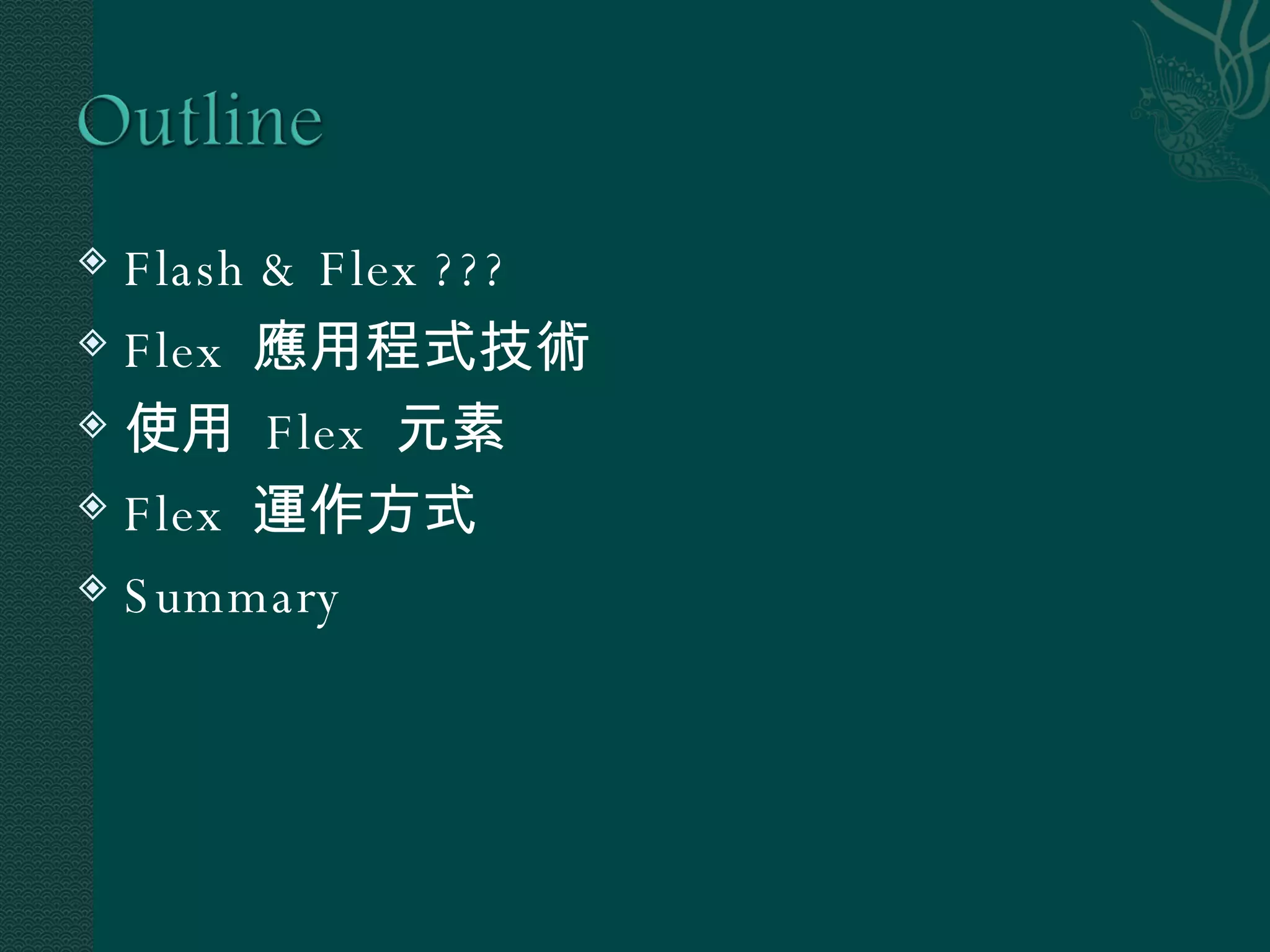 Flex 是一種新技術,主要用於開發富互動網路應用 (RIA),並與 Flash 整合,為開發者提供強大的工具和框架。Flex 使用 MXML 和 ActionScript 進行應用程式開發,簡化了介面的建立過程,並透過編譯器生成可供 Flash Player 執行的 SWF 檔案。文檔描述了 Flex 的架構運作模式及其與 Flash 的互補關係,並分享了學習過程中的挑戰和收獲。