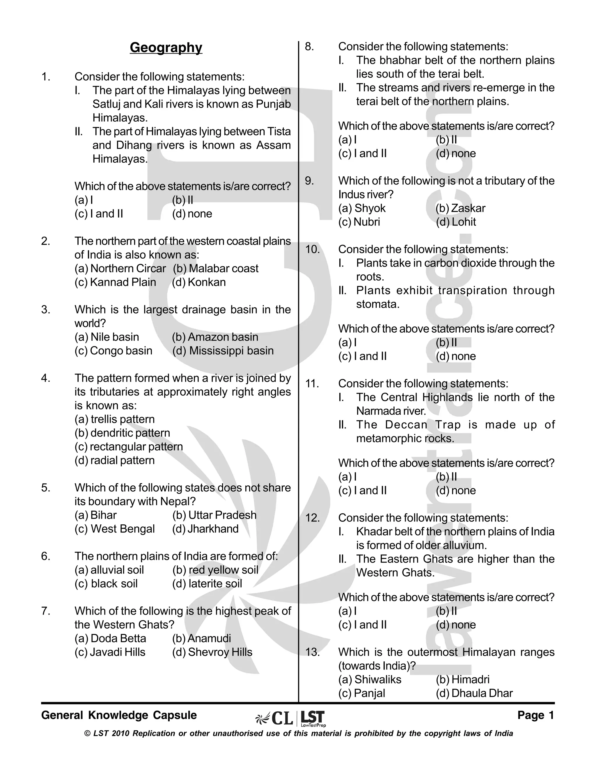 This document contains a general knowledge capsule with 70 multiple choice questions related to geography, science, history and miscellaneous topics. The questions cover topics such as Indian states and their boundaries, physical features of India like rivers and mountain ranges, natural resources and industries, environmental issues, world geography, and basic science concepts.