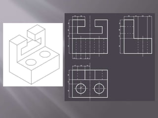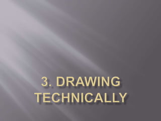 The document discusses various types of technical drawings and their purposes. It provides guidance on techniques for creating drawings, including appropriate tools, line types, annotation rules, perspectives, and scale. Technical drawings must follow specific standards and rules to effectively communicate technical designs and instructions.