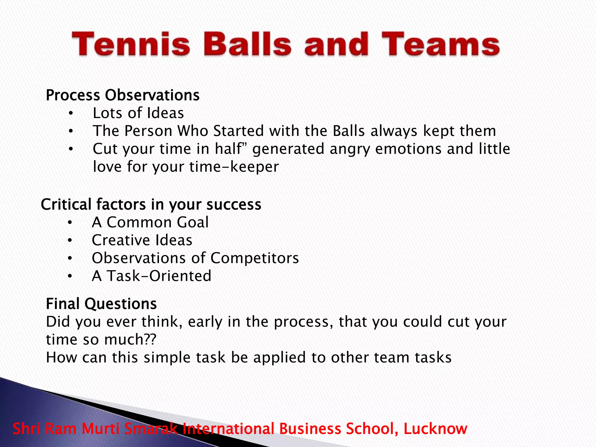 The document provides instructions for a networking exercise involving passing balls between people in a sequence. The rules are that each person can only touch the ball once, balls cannot be passed to an adjacent person, and the ball must return to the original passer. Participants first try with one ball, then two balls, and finally six balls. The document then asks questions about observations during the exercise and critical success factors, and concludes by asking if participants thought they could cut their time so much and how the task could apply to other team exercises.