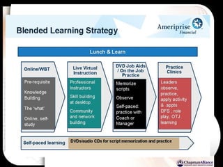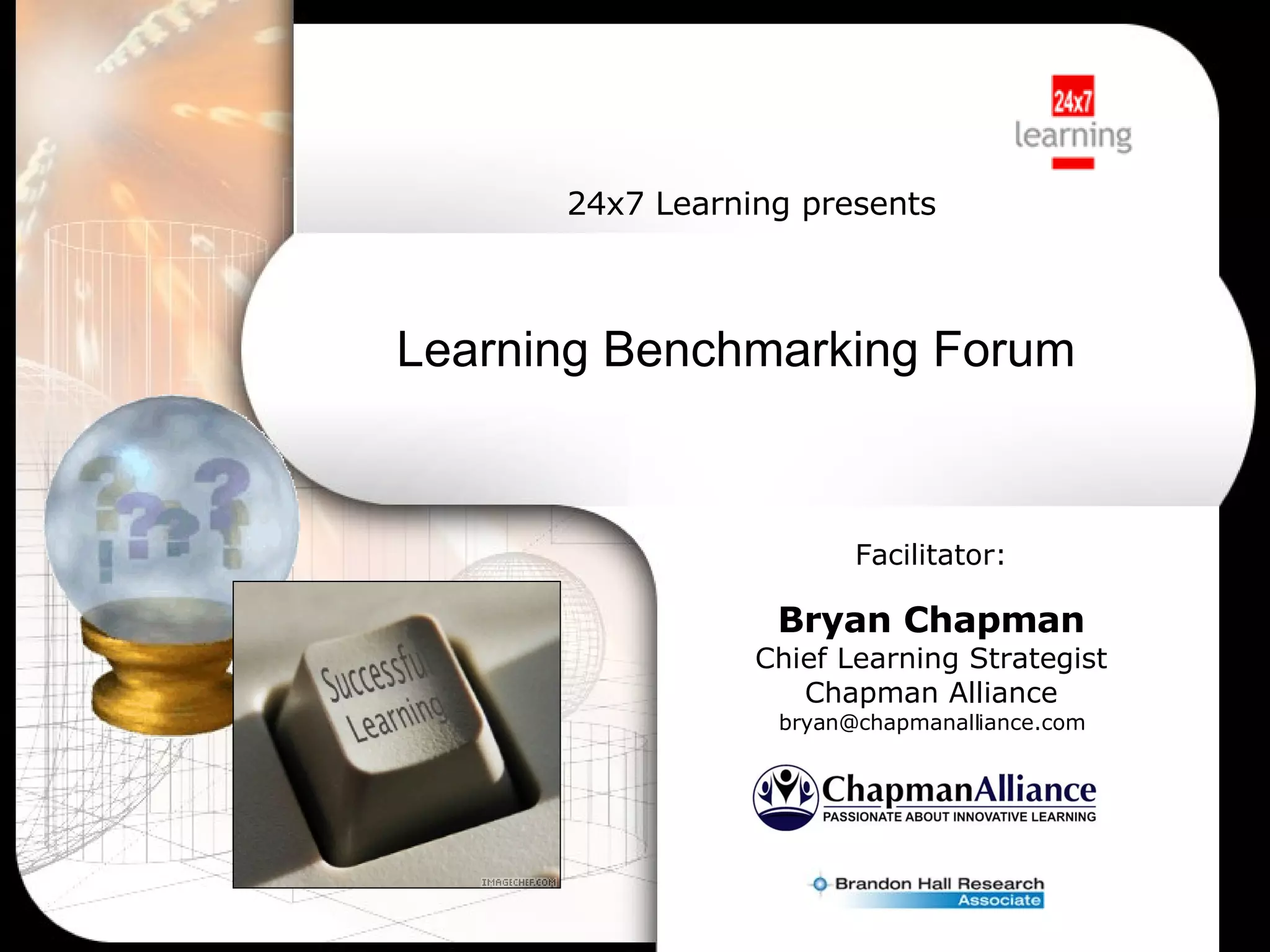 The document discusses a learning benchmarking forum agenda that includes benchmarking learning infrastructure alignment, content development, use of web 2.0 technologies, blended learning, and talent/performance management practices. It provides examples of how different organizations implement blended learning and informal learning strategies. Delivery formats and trends in the industry are also benchmarked.