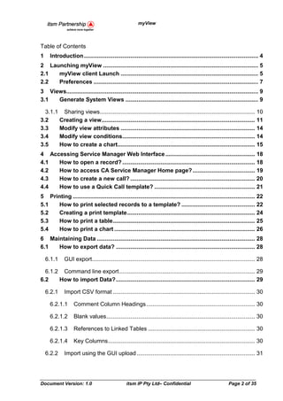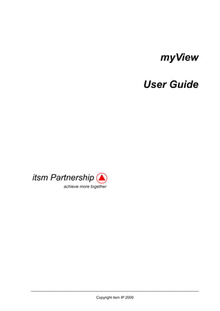 This document provides a user guide for myView, a product that allows users to create, customize, and share views of CA Service Manager data. It describes how to launch myView, create and modify views, access the Service Manager web interface, print records, and maintain data through exporting, importing, and updating records. Key capabilities include generating system views, adding filters and charts to views, opening records, creating new calls, and using templates for printing. The guide also covers preferences, exporting to CSV, and importing data via the GUI or command line.