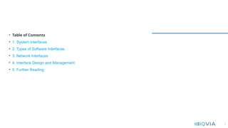 This document serves as a comprehensive guide on interface design and management for system engineers, emphasizing the crucial role interfaces play in connecting systems, applications, and components. It covers various types of interfaces, including user interfaces, file interfaces, and application programming interfaces (APIs), and discusses the importance of effective interface management in complex integration projects. Additionally, it provides insights into network interfaces, architectural principles, and usability heuristics essential for designing efficient and user-friendly interfaces.