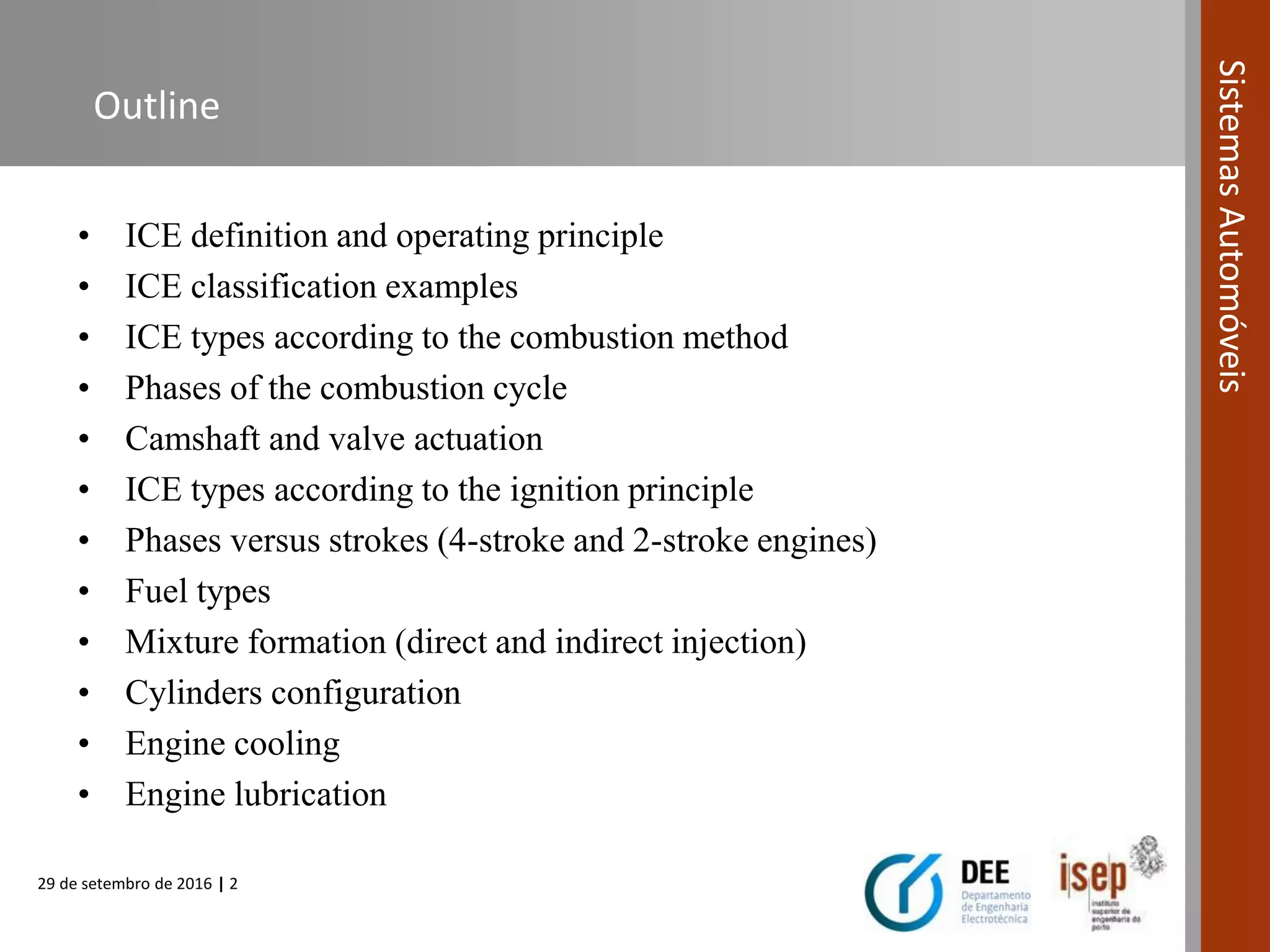 The document provides an overview of internal combustion engines (ICE), including their definition, operating principle, classification, types based on combustion and ignition methods, engine cycles, valve actuation, and fuel systems. It describes the four strokes of a 4-stroke engine as intake, compression, power, and exhaust. It also summarizes 2-stroke and rotary engine cycles. The document aims to cover basic ICE concepts.