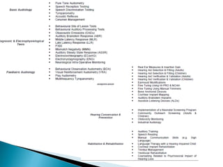 Audiology began as the study of hearing but has evolved into a healthcare profession focused on diagnosing and treating hearing and balance disorders. Audiologists are trained to identify, assess, diagnose, treat, and manage conditions affecting the auditory and vestibular systems through behavioral, physiologic, and electrophysiologic testing. The profession has developed from roots in speech pathology programs after World War II to a clinical doctorate degree (Au.D.) as the standard for entry-level practice in many countries. Audiologists work in a variety of settings and their scope of practice continues to expand with technological and clinical advances.