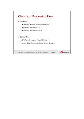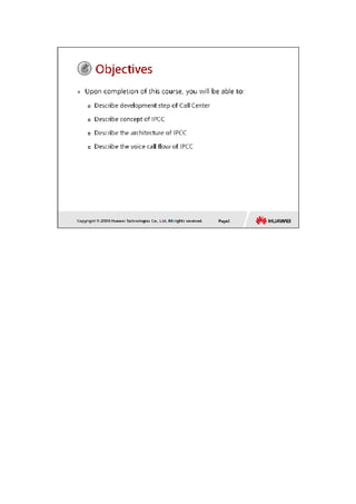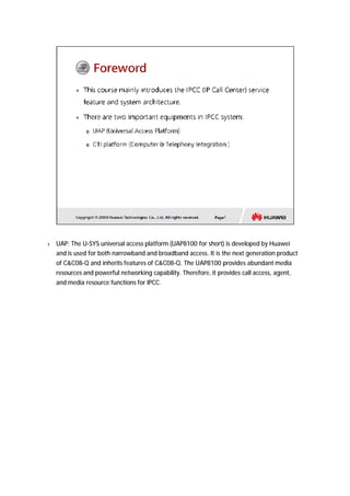 The document provides an overview of call centers and IPCC (Internet Protocol Contact Center) systems. It discusses the evolution of call centers from earlier generations to IP-based systems. It also summarizes the typical components and architecture of an IPCC system, including media servers, databases, and call flows. Key components include the UAP (Universal Access Platform) for call handling, CCS (Call Center Server) for call management, IVR (Interactive Voice Response) for automated services, and various media servers. The document outlines sample call flows for voice, email, fax, and SMS interactions with the IPCC system.