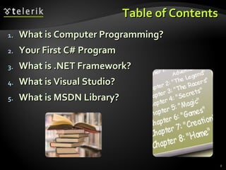 This document provides an introduction to computer programming using C# and the .NET Framework. It discusses what computer programming is, the phases of programming, and an example of a simple "Hello World" C# program. It also covers what is needed to program including knowledge of a language (C#), development environment (.NET Framework and Visual Studio), and documentation (MSDN Library). The document explains what the .NET Framework is, how it provides a runtime environment and class libraries, and how Visual Studio is an integrated development environment for writing, compiling, running and debugging programs. It concludes with a demonstration of creating, building and running a simple C# program in Visual Studio.
