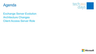 Exchange Server 2013 introduced new server roles that simplified the architecture. The Client Access server role became a thin, stateless proxy server that routes client protocol requests. The Mailbox server role consolidated functionality into a single server that processes, renders, and stores Exchange data. This evolution improved hardware efficiency, simplified deployments, and enabled cross-version interoperability. The Front End Transport service acts as a load-balanced ingress/egress point that determines the optimal Mailbox server for delivering messages to avoid unnecessary hops.
