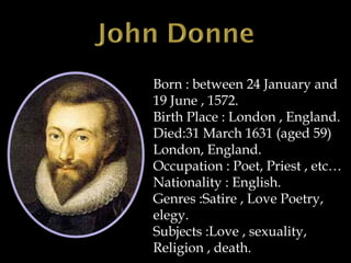 The document is a paper about John Donne and metaphysical poetry. It provides biographical details about Donne, such as his birthplace of London, England, occupation as a poet and priest, and genres including satire, love poetry, and elegy. The paper also lists some of Donne's most famous poems and discusses metaphysical poetry and Donne's mastery of metaphysical conceits. It analyzes one of Donne's poems, "Death be not Proud", describing its theme of addressing death and the poet's depiction of the fear of death.