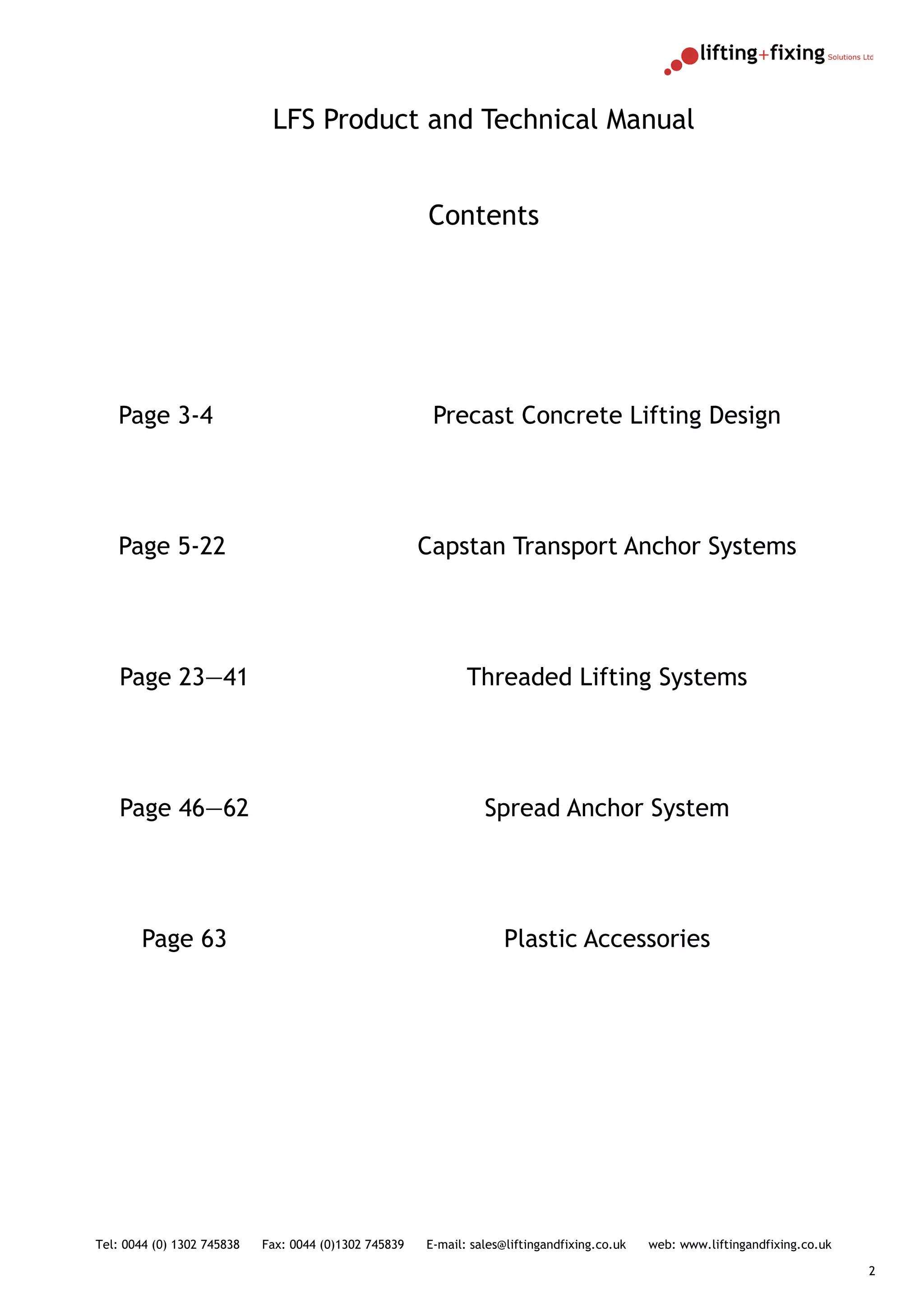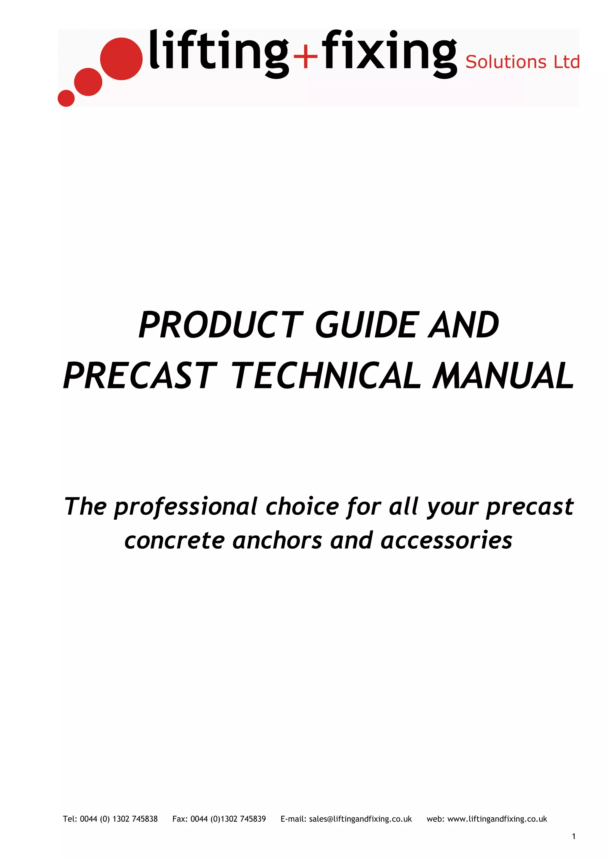 The document provides guidance on selecting and specifying lifting anchors for precast concrete structures. It discusses factors to consider such as the weight and dynamic loads of units, sling angles, and calculating anchor loads. The bulk of the document then describes the Capstan transport anchor system, including different anchor types, accessories, use, specification, and installation instructions. The system is designed for safely lifting, turning, and transporting precast concrete units with minimum embedment depths and edge distances provided.