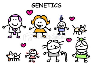 The document discusses the basics of genetics, including that traits are passed from parents to offspring through genes located on chromosomes, and that genes can be dominant or recessive, explaining concepts like Punnett squares and how Gregor Mendel discovered the principles of heredity through experiments with pea plants. It also touches on more advanced genetics topics such as sex-linked traits, codominance, and dihybrid crosses.