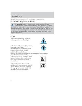 This document provides an overview and instructions for various features of a Ford vehicle owner's manual. It includes sections on instrumentation, controls, starting the vehicle, driving, roadside emergencies, maintenance, specifications and customer assistance. The introduction notes some symbols that may be seen in the vehicle and contains warnings about exhaust emissions and safety restraints. It also contains copyright information and a table of contents.
