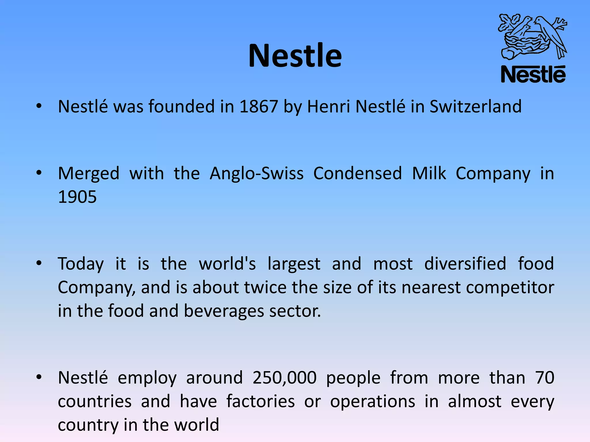 Nestle is the world's largest food and beverage company founded in 1867 in Switzerland. It employs over 250,000 people globally and has operations in almost every country. Nestle operates under a decentralized model where each country manages its own business. In India, Nestle sells a wide range of products from milk and nutrition to chocolate and coffee. It uses a multi-layered distribution network of distributors, super stockists, wholesalers and retailers to supply its products across India from its 7 manufacturing plants. Nestle provides training and incentives to motivate its channel partners.