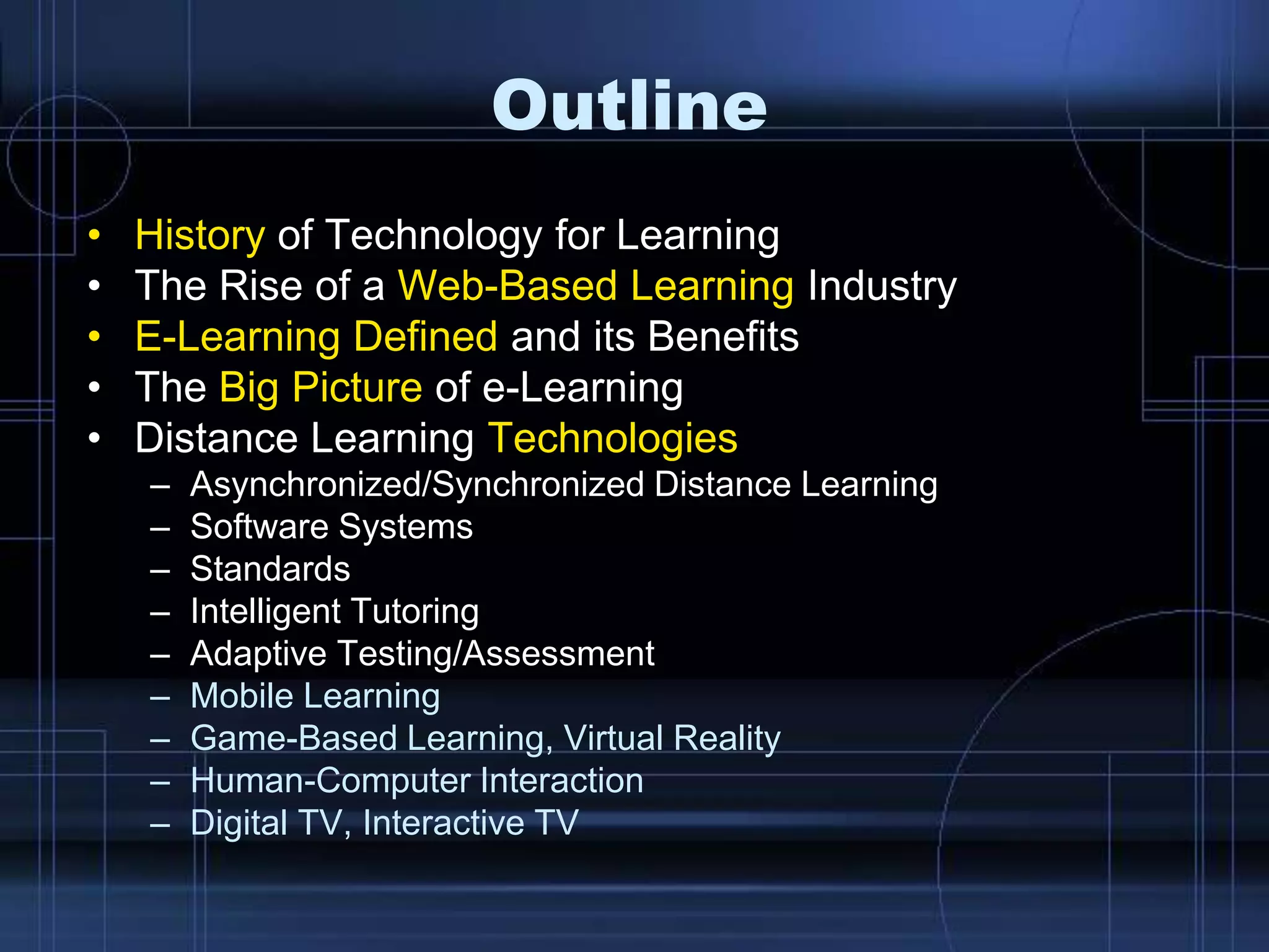 The document provides an overview of the history and technologies of distance learning. It discusses how (1) early technologies like film, television, and computers were used for educational purposes but lacked interactivity; (2) the internet and web-based learning has increased efficiency, interaction and accessibility; and (3) effective distance learning requires addressing issues like content standards, intellectual property, learner support, and technology infrastructure.
