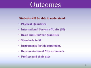 This document provides an overview of physical quantities and the International System of Units (SI) for measuring them. It defines physical quantities as things that can be measured with a magnitude and unit. The SI is standardized by the General Conference on Weights and Measures and uses seven base units: meter, kilogram, second, ampere, kelvin, candela, and mole. Derived quantities are defined in terms of base units, like speed being meters/second. Prefixes are used to modify units for very small or large numbers. The document gives examples of derived quantities and their units, like area being square meters.