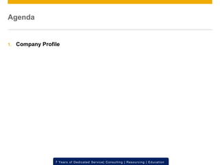 This document provides an onboarding kit for PRIMUS Techsystems Private Limited, an IT company that provides SAP consulting services. It outlines the company's profile, competencies, vision, mission and details of its SAP consulting, resourcing, education and training services. It highlights PRIMUS' experience implementing SAP solutions for clients in various industries and countries. It also lists some of PRIMUS' clients and details of key projects completed. The document is intended to provide new employees with an overview of PRIMUS and the services it offers.