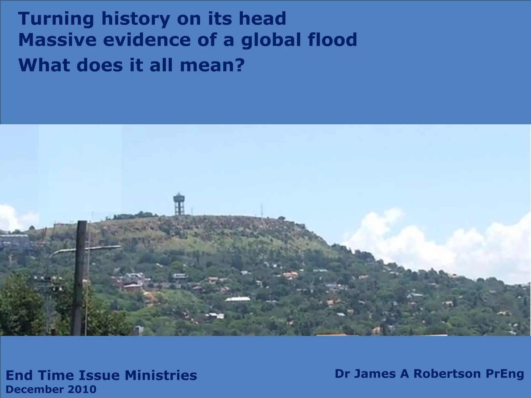 The document presents a controversial exploration of the Earth's history, emphasizing the possibility of a massive global flood and calling into question established geological theories based on extrapolation. Dr. James A. Robertson shares his credentials in engineering and geology while urging critical examination of long-held beliefs about the age of the Earth and the forces shaping it. The document also highlights the instability of the universe and speculates on the implications of dramatic cosmic events on Earth's geological history.