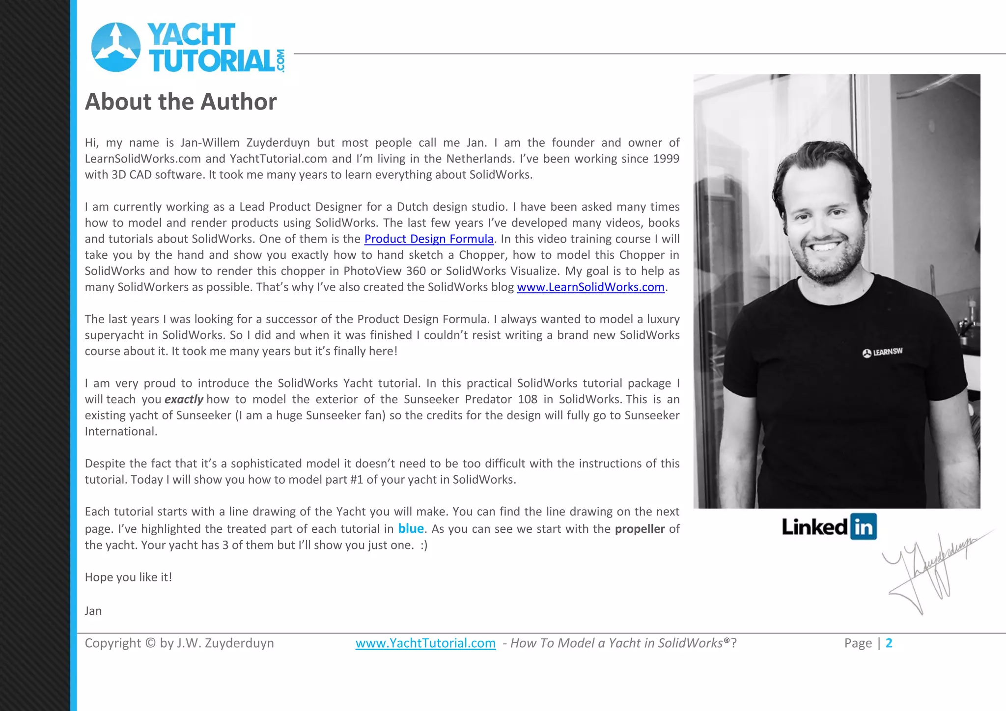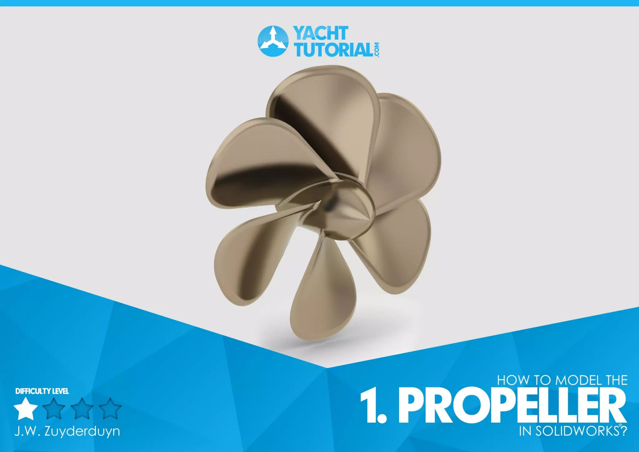 This document is a tutorial for modeling a propeller in SolidWorks. It provides step-by-step instructions for creating sketches, features like revolves, lofts, and patterns to model a propeller. The tutorial is written by Jan-Willem Zuyderduyn, who created a series of SolidWorks tutorials for modeling a luxury yacht. It guides the user through modeling one propeller blade and then using a circular pattern to create all six blades. Color and appearance modifications are also demonstrated to complete the propeller model in SolidWorks.