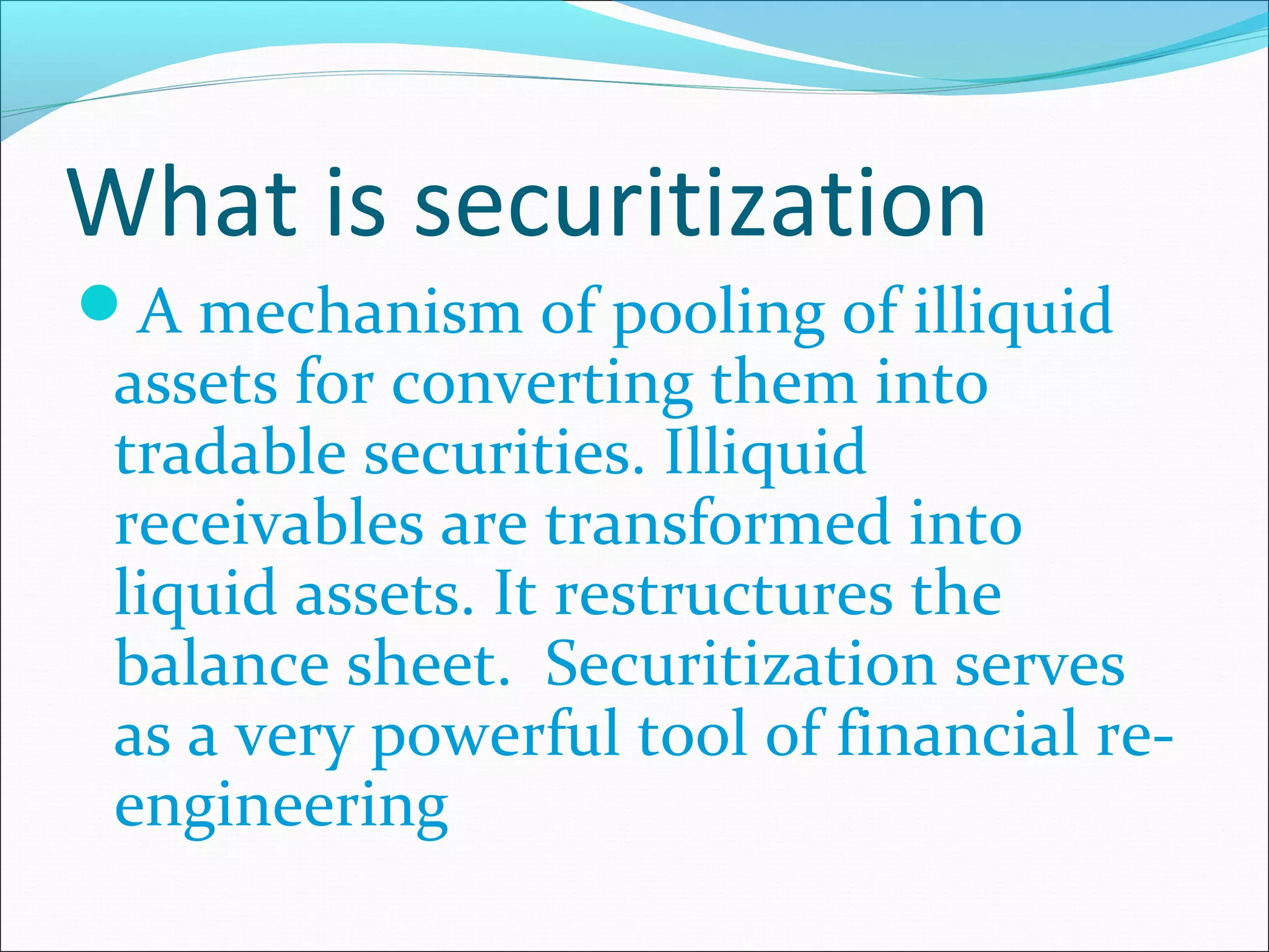 Securitization is a mechanism that pools illiquid assets and converts them into tradable securities. This transforms illiquid receivables into liquid assets and restructures balance sheets. Securitization serves as a powerful tool for financial reengineering. Common assets that are securitized include mortgages, loans, and receivables. Pioneers of securitization include the US, UK, France, Australia, and others. The first securitized asset was automobile loans. The securitization process involves credit rating the receivables, selling the assets to a special purpose vehicle which issues securities to investors to fund the asset purchase. Key players are the originator, SPV, investors, and credit rating agencies. Challenges