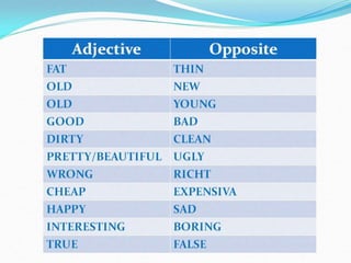 This document lists a series of opposites including strong/weak, short/tall, slow/fast, heavy/light, ugly/beautiful, boring/funny, and big/small. It does not provide any context or explanation for these opposing terms.