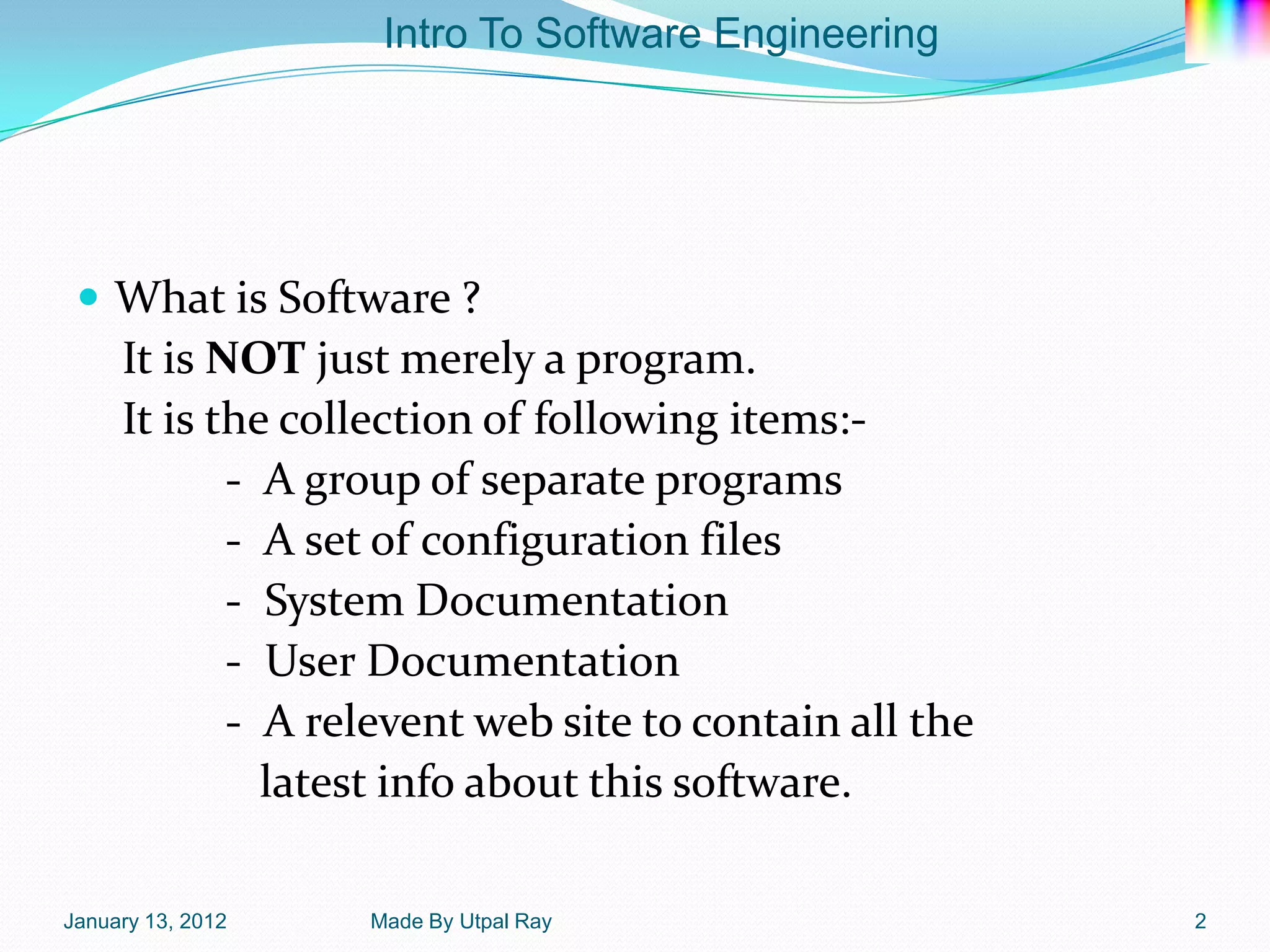 The document introduces software engineering. It defines software as more than just programs, including documentation, configuration files, and websites. Software engineering is concerned with developing large-scale systems cost-effectively, while computer science focuses on theory and fundamentals. Good software satisfies requirements, is maintainable, dependable, usable, and portable. Key challenges include legacy systems, diversity, reduced delivery times, and cost. The document outlines the software engineering process and tools used.