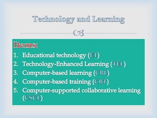 Educational technology utilizes technology to improve learning and performance. It relies on a broad definition of technology, including both physical objects and abstract systems. Technology-enhanced learning (TEL) uses technology to support any learning activity and focuses on the interplay between learning activities and technologies. Computer-based learning uses computers as a key part of the educational environment, while computer-based training provides self-paced learning via computers or devices. Computer-supported collaborative learning uses technology to encourage students to work together on learning tasks.