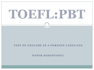 The document provides information about the Paper-Based Test of English as a Foreign Language (TOEFL PBT). It details that the TOEFL PBT has three sections - Listening Comprehension, Structure and Written Expression, and Reading Comprehension - and that test takers can receive a total score between 217 to 677 points. It also notes that the Listening Comprehension section consists of short conversations, long conversations, and talks, while the Structure and Written Expression section involves filling blanks and writing short responses.