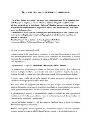 Il documento evidenzia l'importanza dell'attitudine nell'insegnamento, paragonandola alla cura con cui un agricoltore nutre i propri animali. Viene sottolineato che l'educazione richiede non solo conoscenze teoriche ma anche esperienze pratiche e una predisposizione naturale, che deve essere coltivata attraverso il tirocinio. Infine, si parla della necessità di riformare la formazione degli insegnanti, ponendo attenzione su elementi verificabili e sull'importanza del contesto formativo.