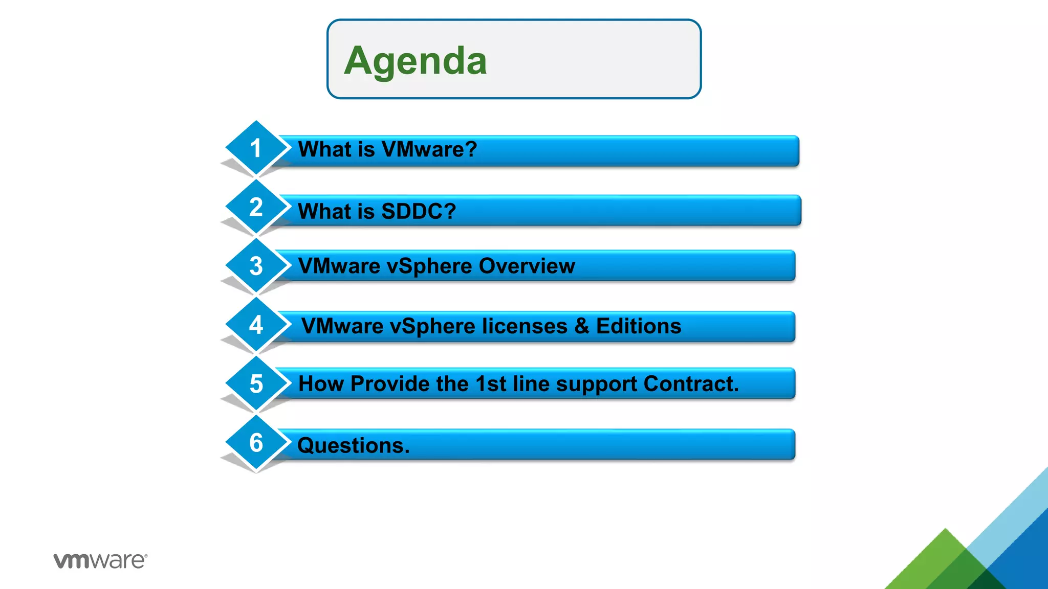 This document provides an overview of VMware virtualization components and features. It discusses ESXi and vCenter Server communication, vSphere HA which restarts VMs on failure, vMotion for live migration, and Storage vMotion for live storage migration. The document also outlines VMware vSphere licenses and editions and asks how to provide first line support.
