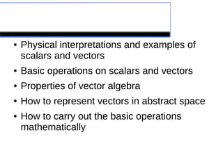 This lecture introduces the concepts of vectors and scalars, explaining their definitions, properties, and how to perform basic operations with them. It covers topics such as vector representation, addition, subtraction, and different algebraic manipulations in a coordinate system, emphasizing the differences between vectors and scalars. The lecture also includes examples and cautions against incorrect operations involving vectors and scalars.