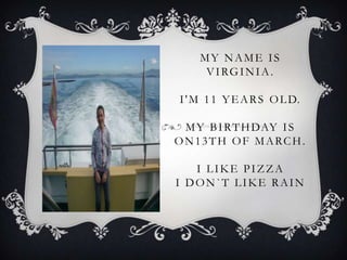 Virginia is an 11-year-old girl whose birthday is March 13th. She likes pizza but does not like rain.
