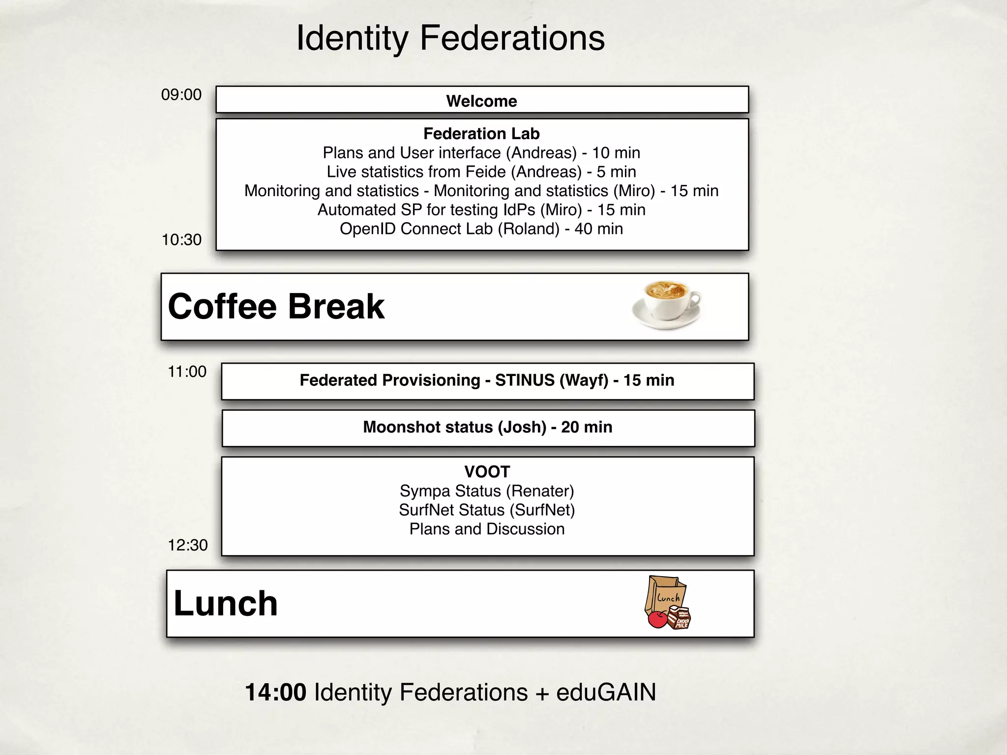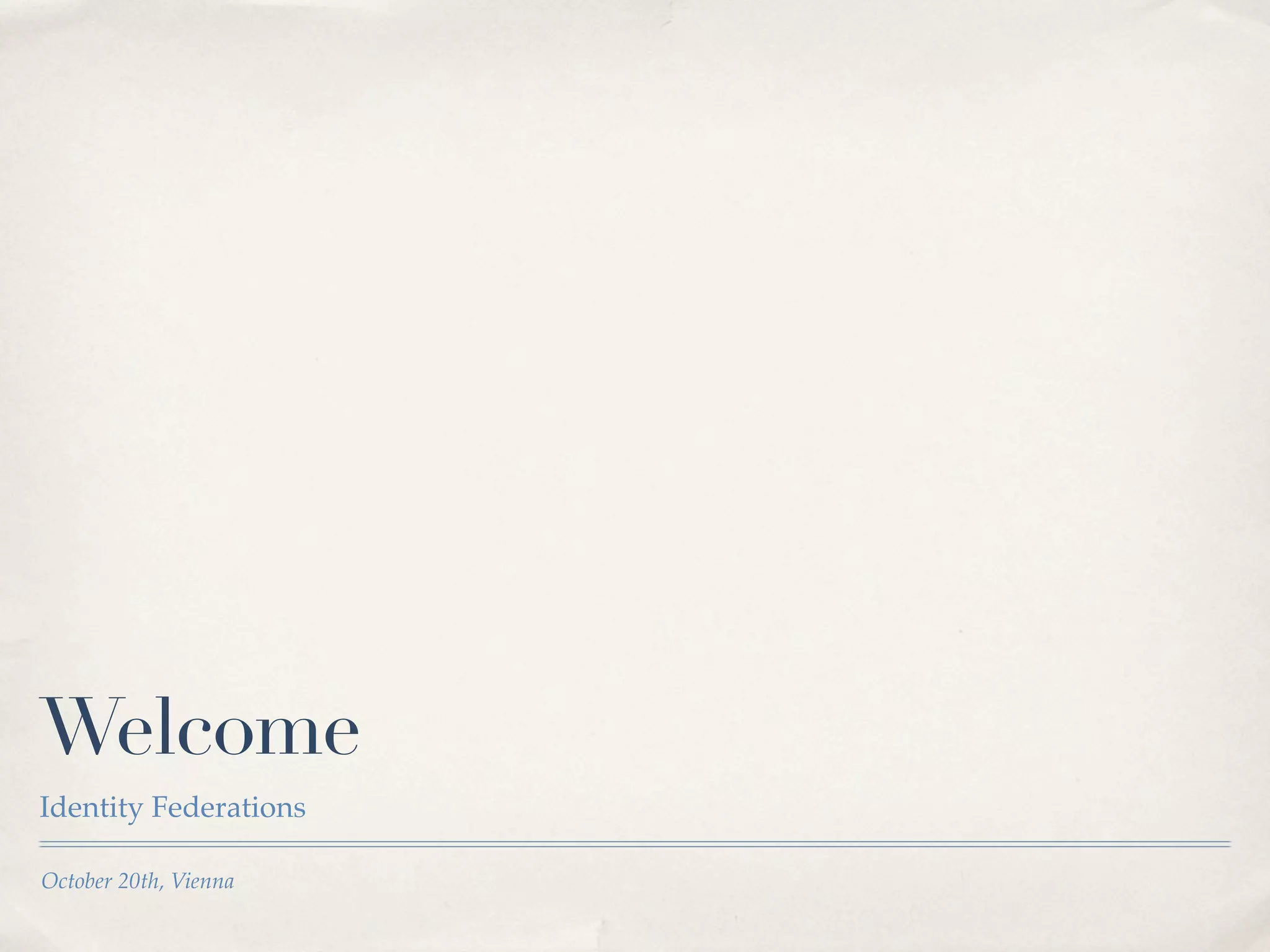 The document outlines an agenda for a welcome session on identity federations held in Vienna on October 20th, detailing presentations and discussions covering various topics such as federated provisioning, the status of Moonshot and Voot Sympa, and the EduGAIN connectivity workflow. It includes a schedule of activities, coffee breaks, and sessions dedicated to the Federation Lab and its testing capabilities for service and identity providers. The final notes suggest that further collaboration and monitoring will enhance the testing federations.
