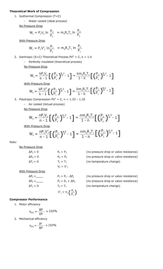 Compressors raise the pressure of a flowing fluid by mechanical work. There are two main types: reciprocating for high pressure/low flow, and rotative for low pressure/high flow. Compressed air has many industrial applications. Compressor performance is evaluated based on factors like motor efficiency, mechanical efficiency, compression efficiency, volumetric efficiency, and overall efficiency. Problems involve calculating mass flow rate, power requirements, and other parameters for given compressor specifications and operating conditions.