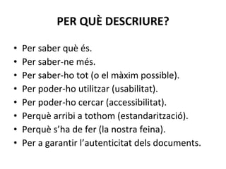 PER QUÈ DESCRIURE?Per saber què és. Per saber-ne més. Per saber-ho tot (o el màxim possible). Per poder-ho utilitzar (usabilitat). Per poder-ho cercar (accessibilitat). Perquè arribi a tothom (estandarització). Perquè s’ha de fer (la nostra feina). Per a garantir l’autenticitat dels documents.