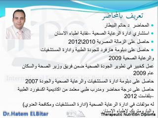 الوثيقة تتحدث عن الدبلومة في التغذية العلاجية، وتتضمن معلومات عن المحاضر ومؤهلاته. تهدف الدبلومة إلى تعليم أساسيات التغذية في المستشفيات وكيفية التعامل مع مختلف الأمراض من خلال التغذية. كما تتناول الوثيقة مكونات الأغذية وأهمية كل منها في النظام الغذائي للإنسان.