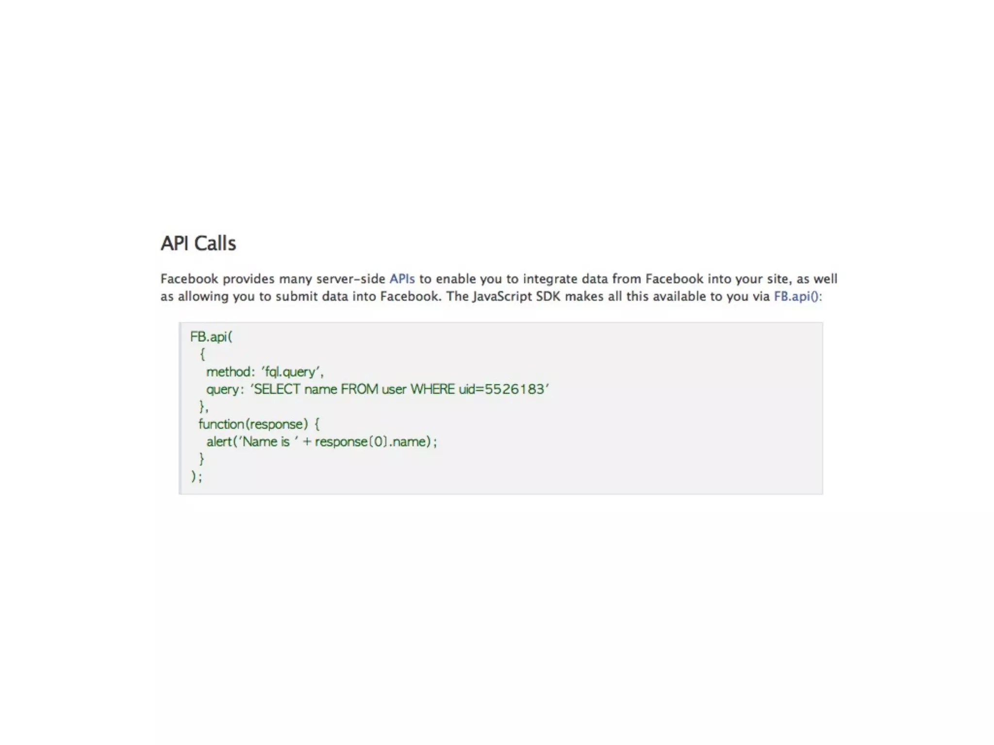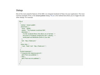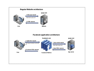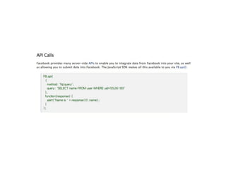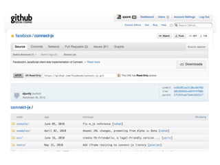 This document provides an overview of Facebook development from 2007 to 2010. It discusses the evolution of Facebook Platform tools including a transition from FBML to JavaScript and the Graph API. Key metrics are presented on growth of the Platform from 1 million developers in 2007 to over 550,000 applications and high user engagement by 2010. The document also reviews integration points and tools like the JavaScript SDK and Social Plugins that simplify building applications on and connected to Facebook.
