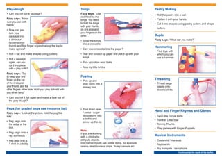 This document provides instructions and ideas for level one of the "Clever Hands Puzzles Training Games" program. The level is designed for beginners and focuses on developing hand dexterity and strength. Suggested activities include puzzles, feely games, play dough, threading, hammering, and hand/finger rhymes and games. The goal is to have fun repeating the activities regularly to improve fine motor skills.