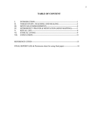 This document provides an overview of Laura Li-Hua Sun's spiritual development plan based on her participation in a Messianic Jewish spirituality course. She outlines how she will develop in six areas: Torah study, mitzvah (commandment), hitbodedut/prayer and meditation, ritual life, and ethical living. Specifically, she plans to increase her Torah study and teaching, follow commandments as a response to God, deepen her prayer life through hitbodedut, incorporate spiritual disciplines like confession and solitude into her ritual life, and ground her ethical living in community. The document analyzes each area through a Jewish lens and references how biblical figures can provide models for her spiritual growth.
