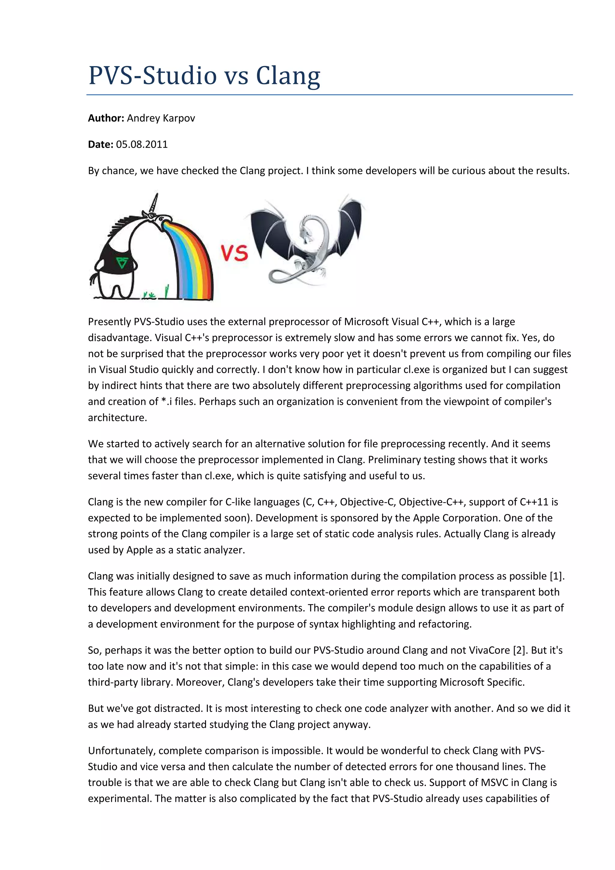 PVS-Studio analyzed the Clang compiler source code and found several copy-paste errors introduced by duplicating code fragments without updating variable names or logic. The errors included identical expressions on both sides of logical operators, functions clearing the wrong variable, and missing breaks in switch statements. PVS-Studio also flagged some potentially erroneous or suspicious code that may or may not be bugs, such as redundant checks or assignments. The analysis demonstrates issues that can arise from copy-pasting code without modification and highlights opportunities for Clang developers to improve quality through further review.