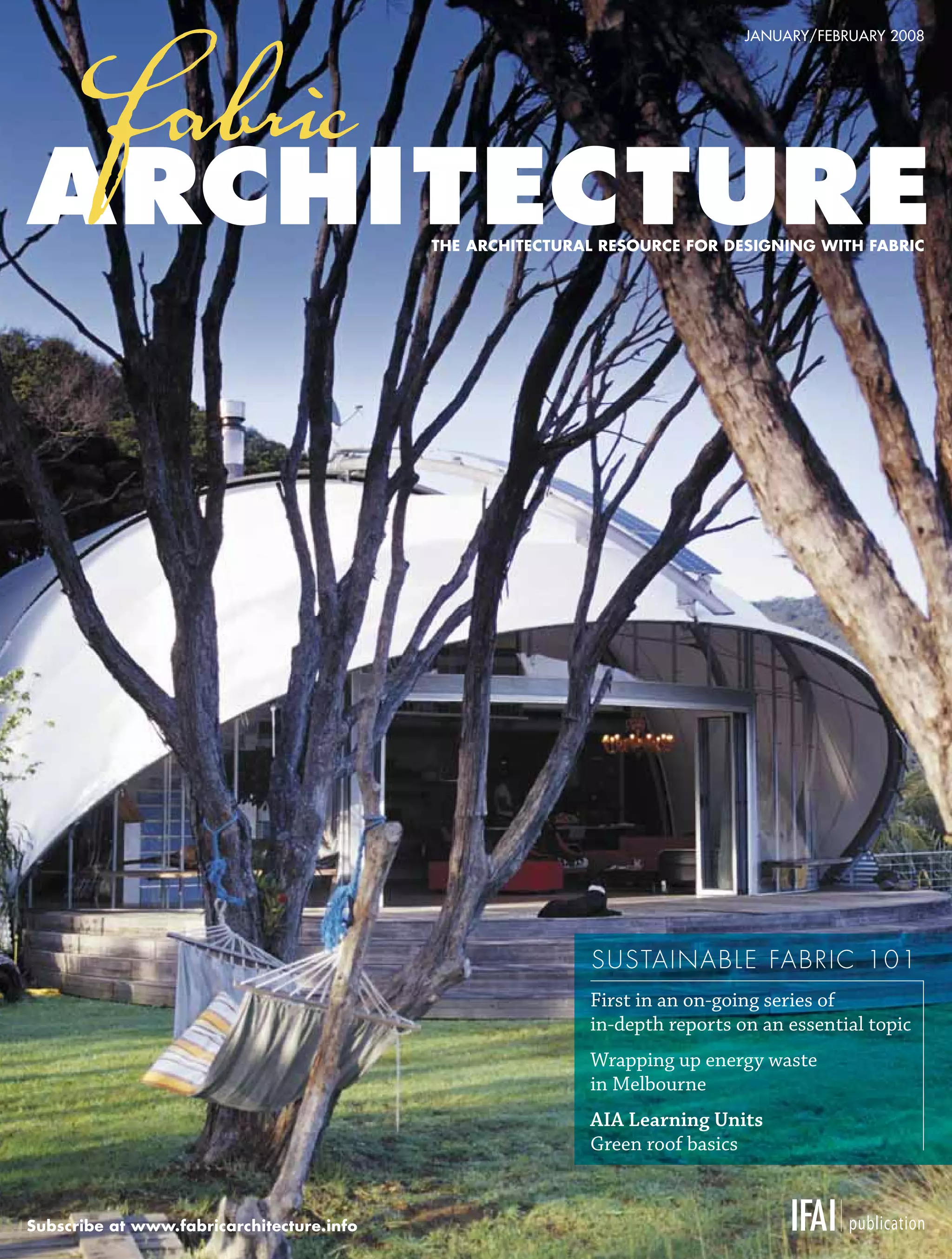 This document is the January/February 2008 issue of Fabric Architecture magazine. It focuses on sustainable design using fabric, with multiple articles on this topic. The issue examines sustainable fabric from various perspectives to provide the latest industry information to designers. Articles explore how fabric can help lead sustainable design, how inflated plastic bubbles were used to enclose a shopping mall in Australia solving energy waste, and how a canopy was used on a New Zealand home.