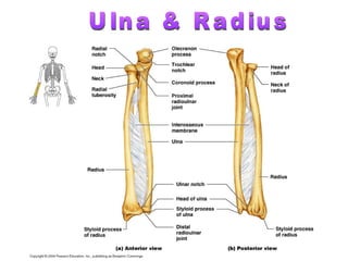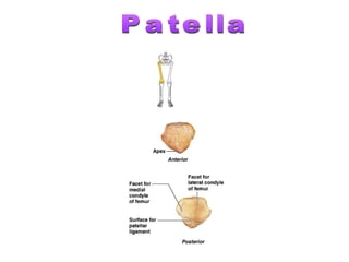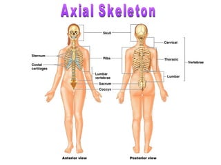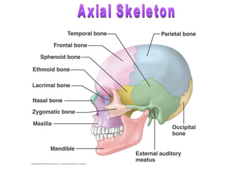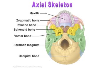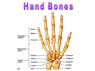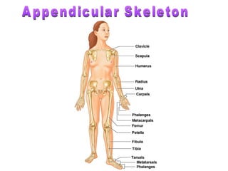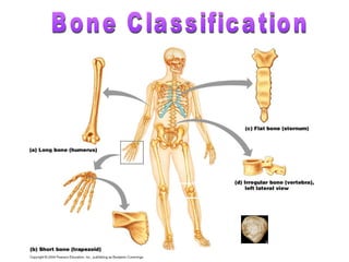 This document provides information on the structure and function of bones and the skeletal system. It discusses the different types of bones in the human body, including long bones, short bones, flat bones, and irregular bones. The document outlines the basic structure of bones, including the diaphysis, epiphyses, periosteum, and marrow. It also describes bone growth and development from early fetal stages through childhood and adulthood. Additionally, the document covers bone repair, common bone diseases like osteoporosis and rickets, and joints and joint movement.