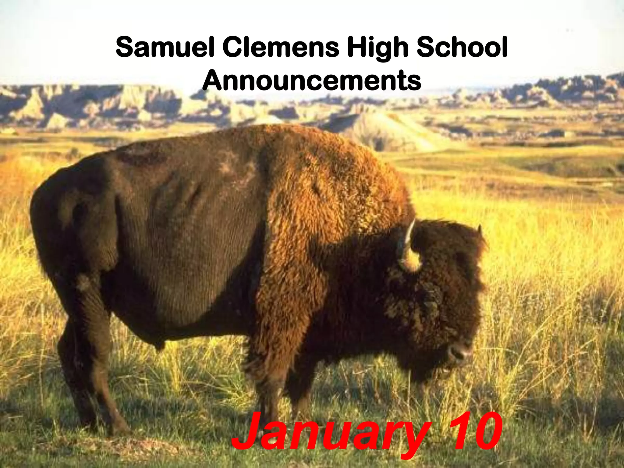 The document contains announcements for Samuel Clemens High School including exam schedules, club meetings, athletic events, scholarship opportunities and deadlines. Upcoming events include a Young Leaders conference, theater auditions, a bake sale, soccer games, and National Honor Society and BPA meetings. Students are reminded of application and payment deadlines for programs and the yearbook.