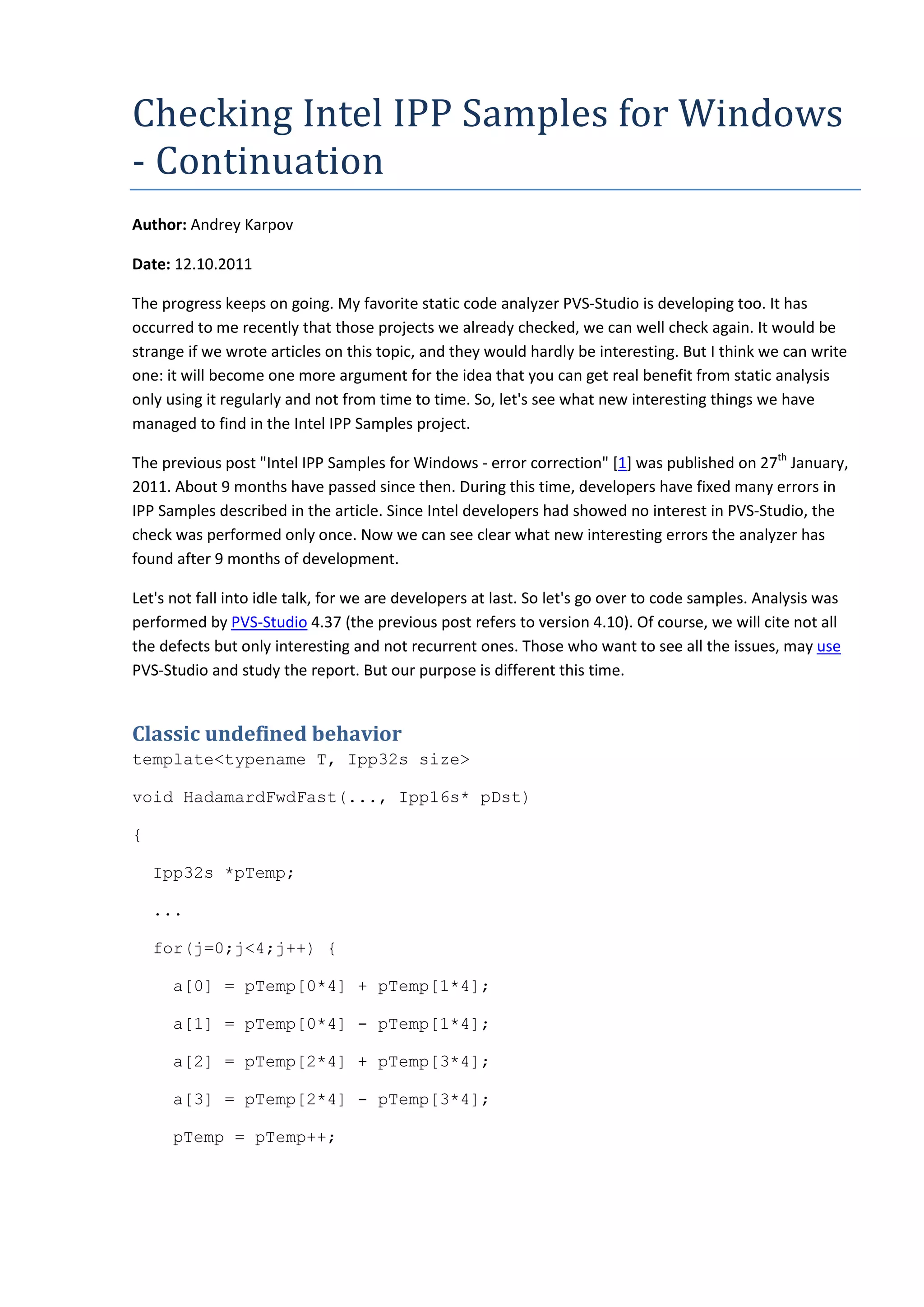 The document discusses an analysis of Intel IPP samples using the PVS-Studio static code analyzer, highlighting new errors found after nine months since the last review. Key issues include instances of undefined behavior, redundant code, and potential array overruns, with the author emphasizing the importance of regular static analysis in improving code quality. The conclusion encourages developers to integrate static analysis into their workflow to identify errors early in the development process.