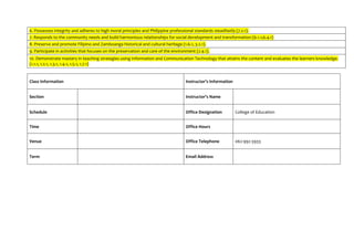 This document outlines a course on the Teaching Profession for the Bachelor of Technical-Vocational Teacher Education program at the Colegio de la Ciudad de Zamboanga. The 3-unit course aims to help pre-service teachers understand the roles and responsibilities of teachers based on philosophical, historical, legal and socio-cultural factors. Over 18 weeks, students will develop competencies related to articulating a personal teaching philosophy, understanding laws governing the profession, and formulating a professional development plan. Assessment includes exams, projects, and a reflective journal. The course adheres to standards for teacher education and aims to develop qualities of competence, character, and charity in students.