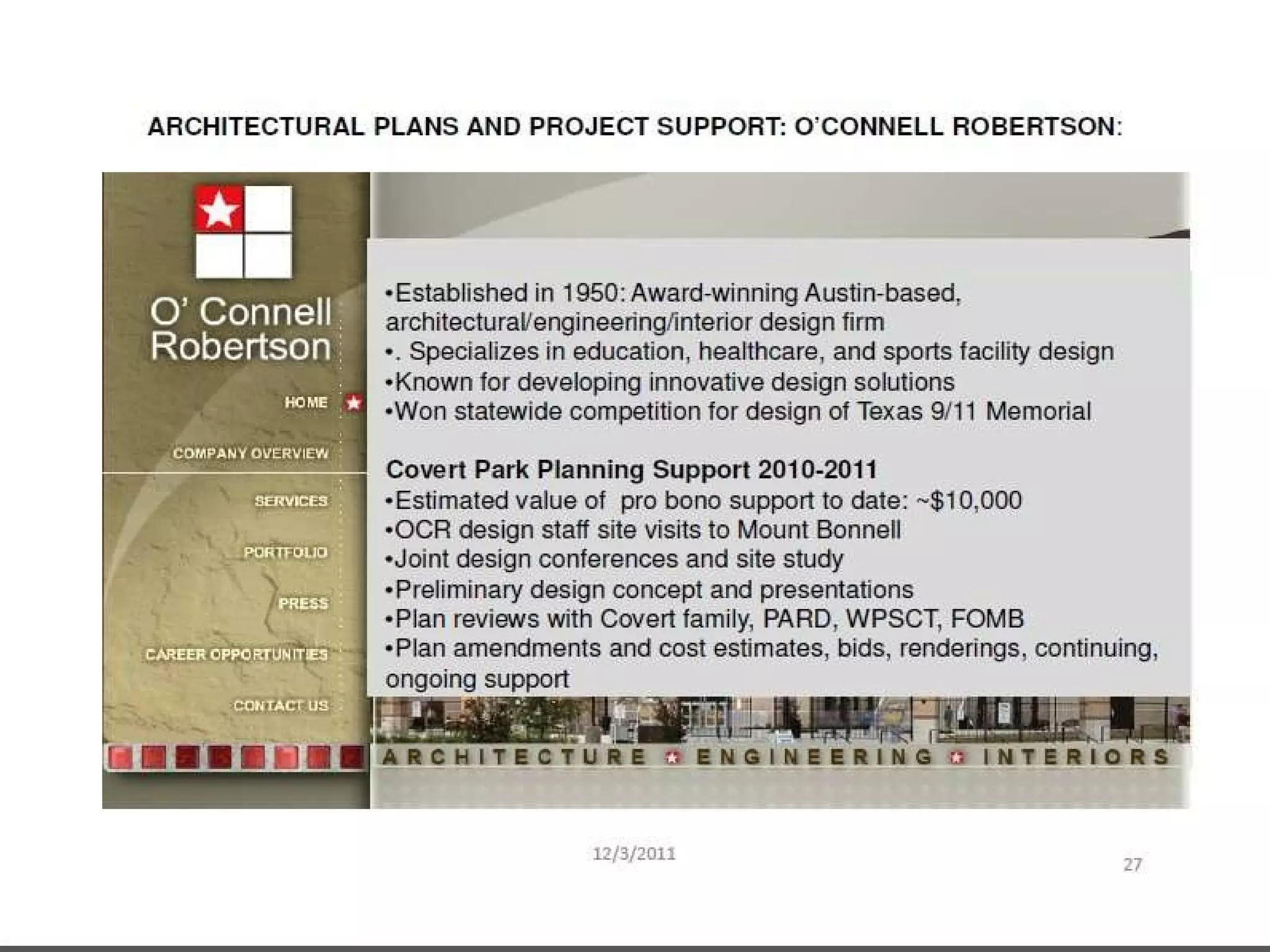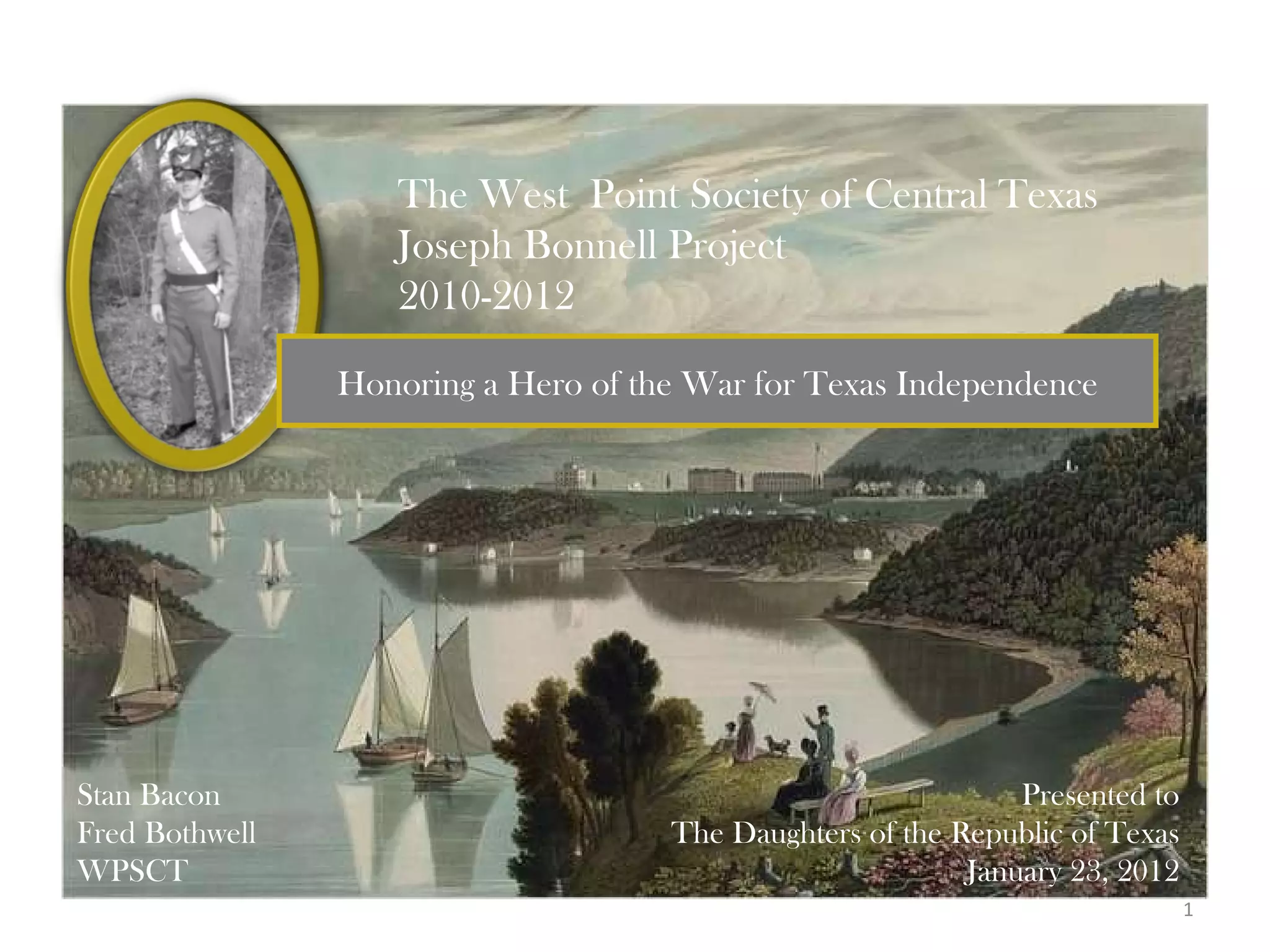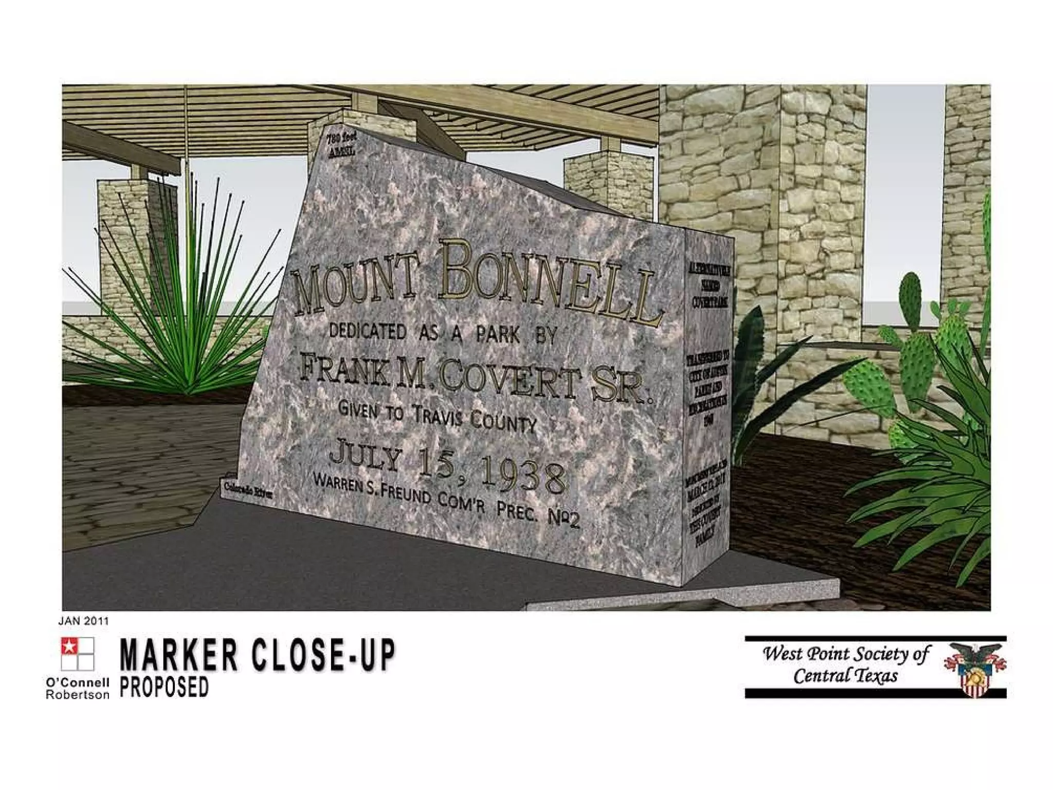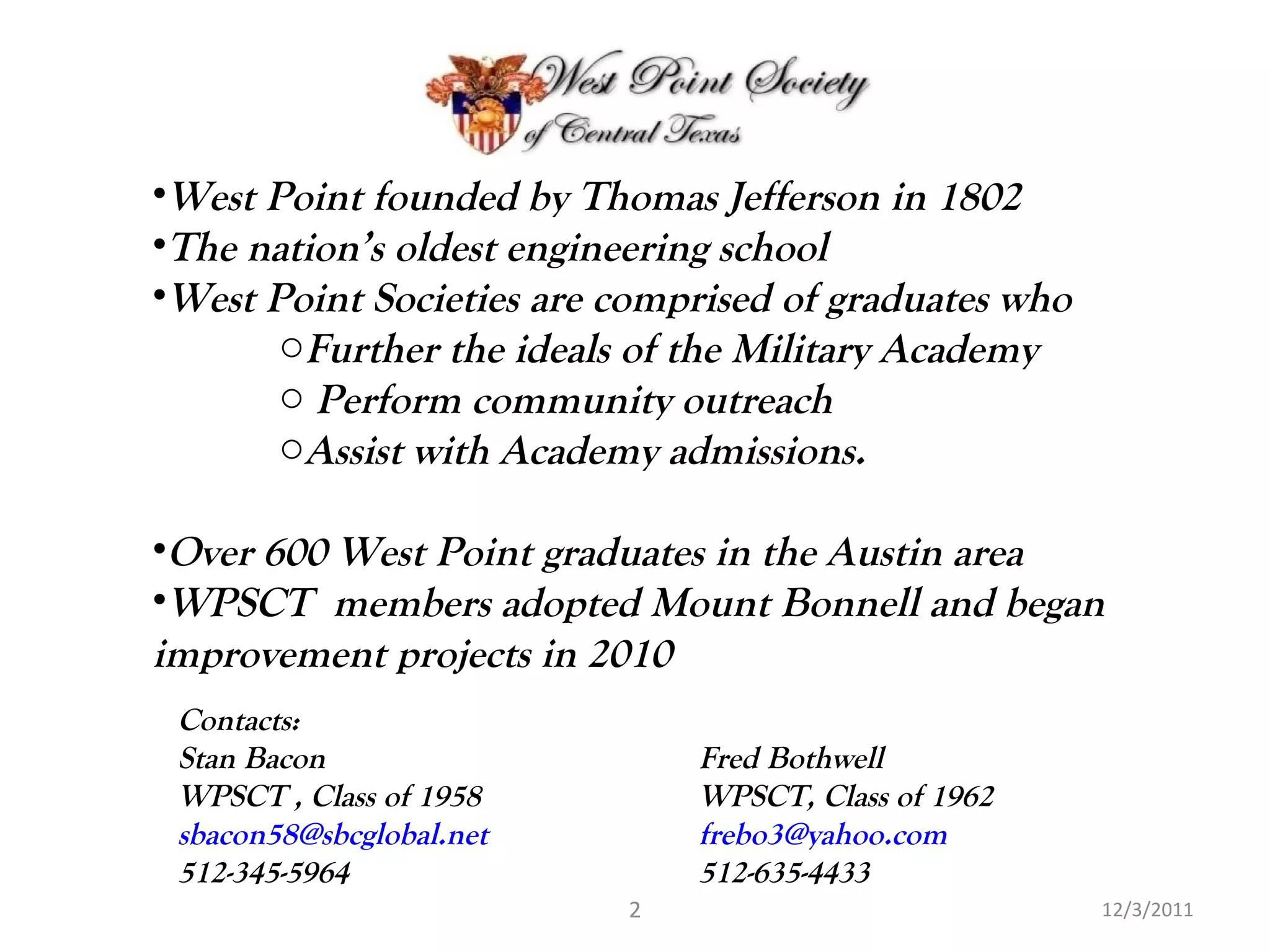 The document details the West Point Society of Central Texas (WPSCT) and their efforts to honor George W. Bonnell at Mount Bonnell through community projects from 2010-2012. It discusses the controversy surrounding the origin of the mountain's name, various restoration initiatives, and plans for a new marker to replace the deteriorating original. The report highlights the importance of preserving historical markers and landscaping for public enjoyment while acknowledging the challenges faced in gaining approval for changes to the site.