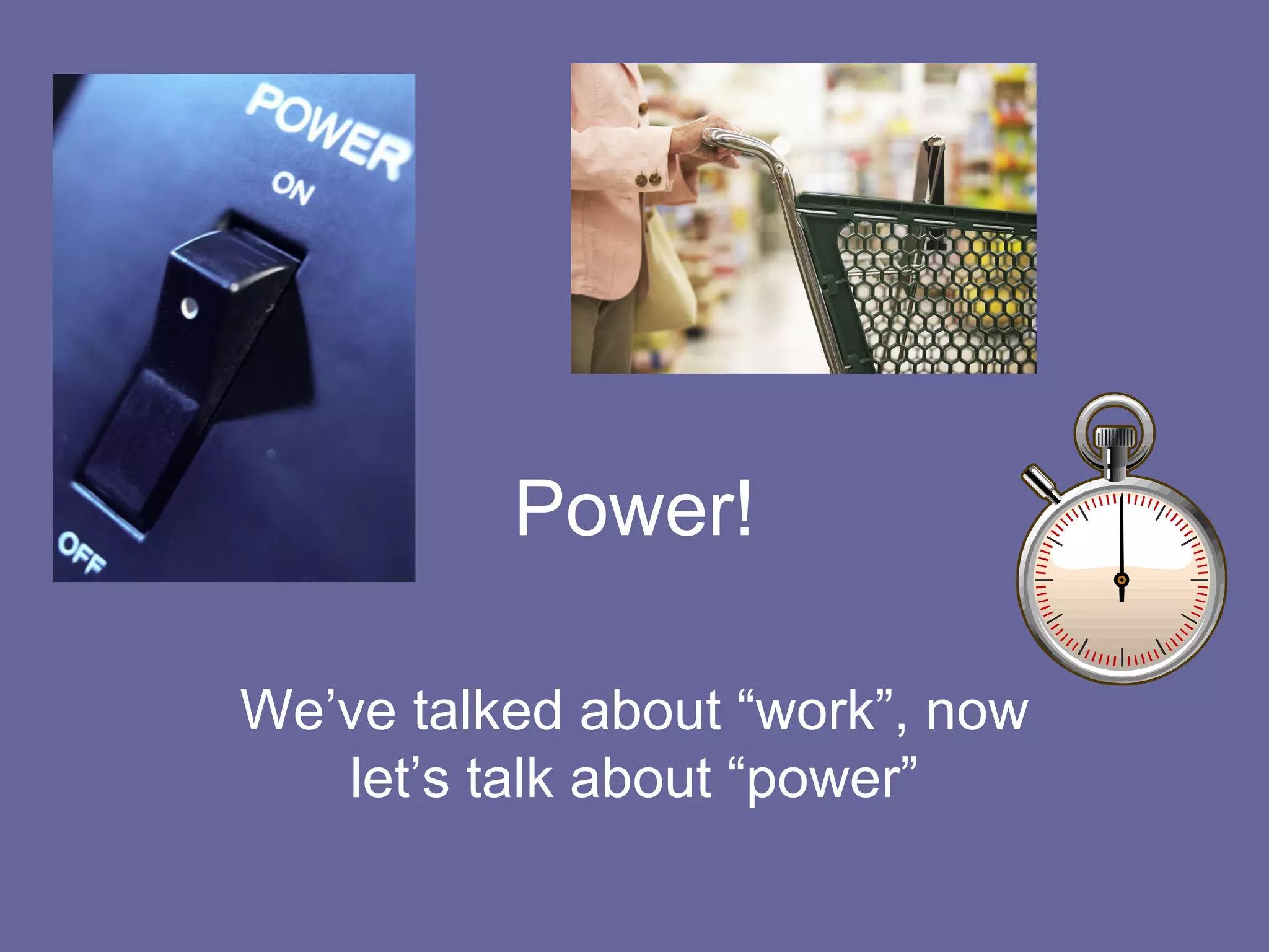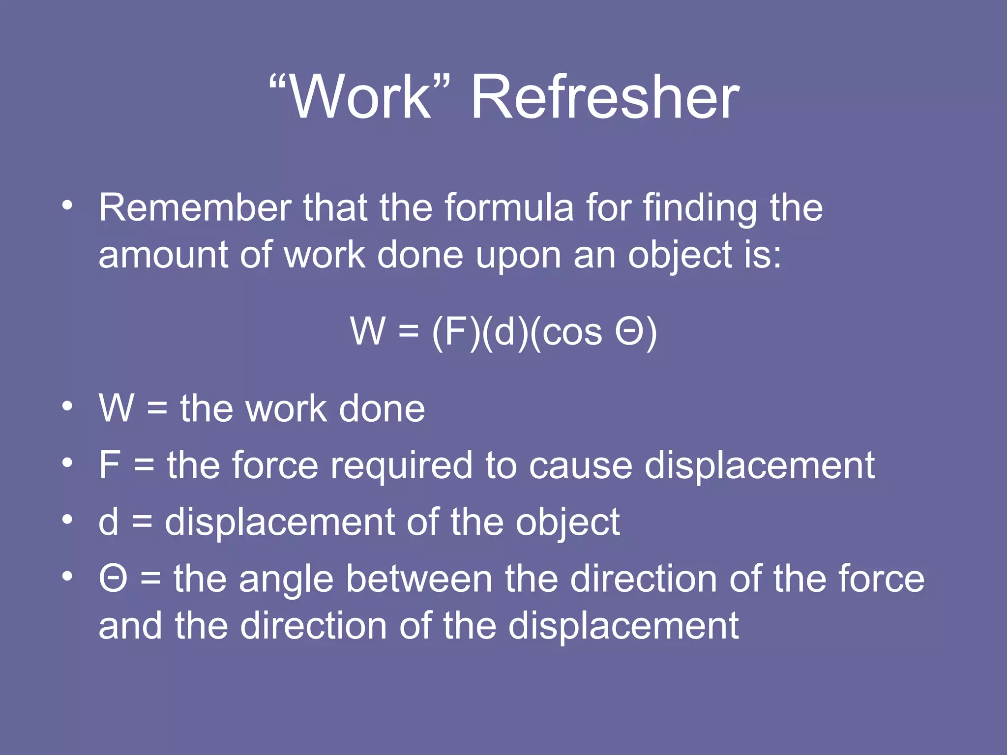 The document discusses power and how it relates to work. It defines power as the rate at which work is done, and provides the formula that power is equal to work divided by time. It gives examples of calculating power from examples of objects being moved over distances in certain times, applying force. Units of power like watts and horsepower are also explained.