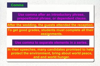 The document provides guidelines on proper punctuation, capitalization, and number usage in writing. It discusses the use of commas, semicolons, colons, parentheses, dashes, quotation marks, and apostrophes. It also covers rules for capitalizing words, titles, proper nouns, and abbreviations. Finally, it offers tips for writing numbers, such as spelling out or using figures, rounding numbers, and combining words with figures for clarity.