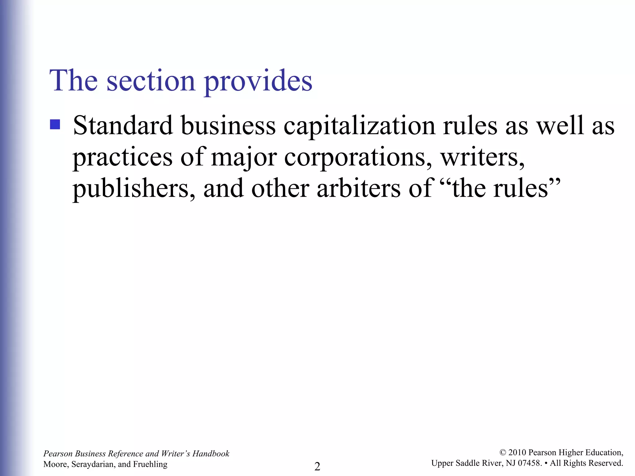 The document outlines standard capitalization rules for business writing, emphasizing the importance of consistency and adherence to current practices. It specifies when to capitalize proper nouns, titles, geographical names, time periods, holidays, and cultural observances. Additionally, it highlights the impact of capitalization errors on reader comprehension.