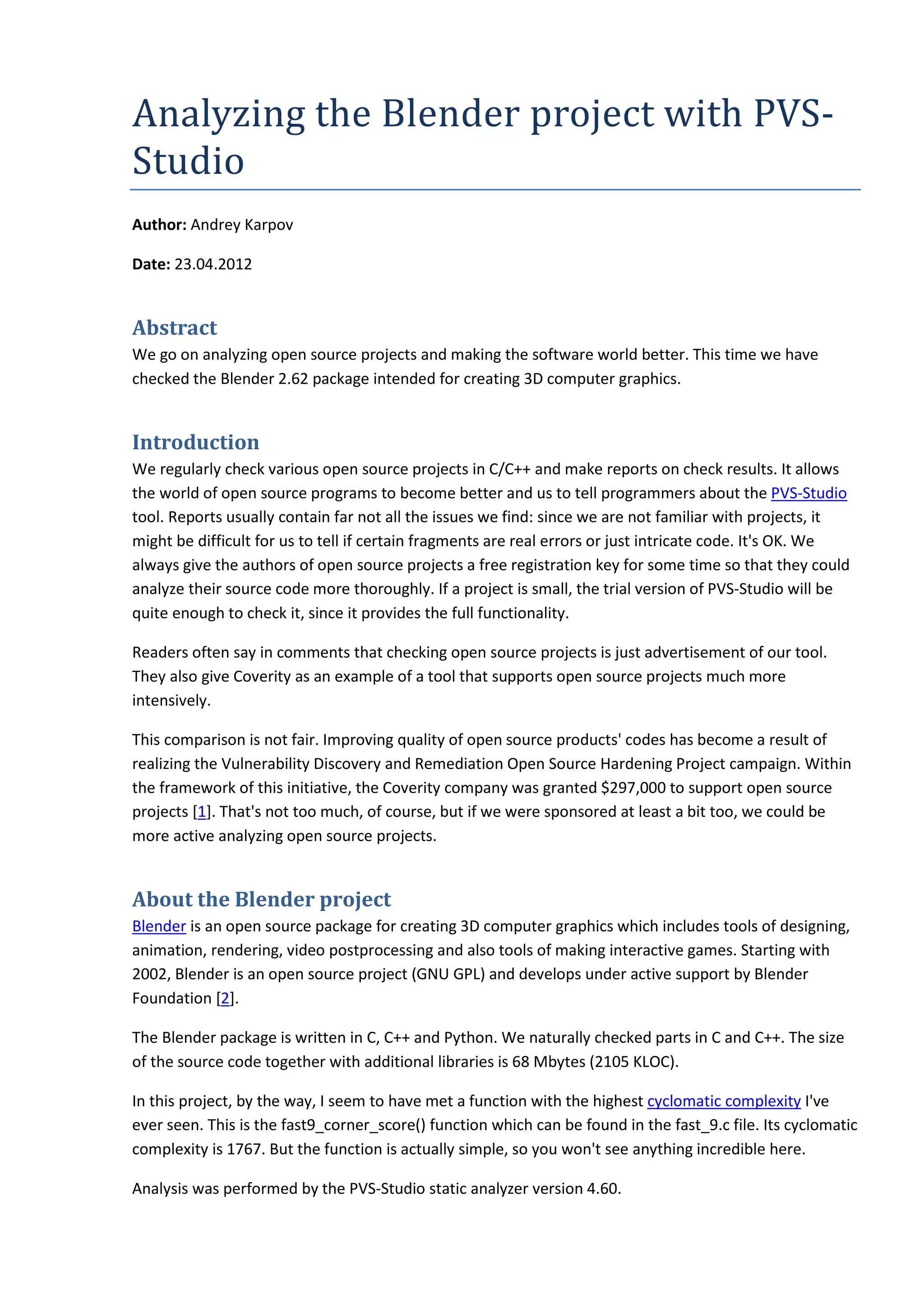 The document analyzes the Blender 2.62 package, discussing its use of the PVS-Studio static analyzer to identify code quality issues and potential errors. It highlights the challenges posed by false positives due to the code's style and details several specific warnings and errors found during analysis, including incorrect macros and misprints. The findings underscore the importance of using tools like PVS-Studio to improve the quality of open-source software by allowing developers to address code vulnerabilities effectively.
